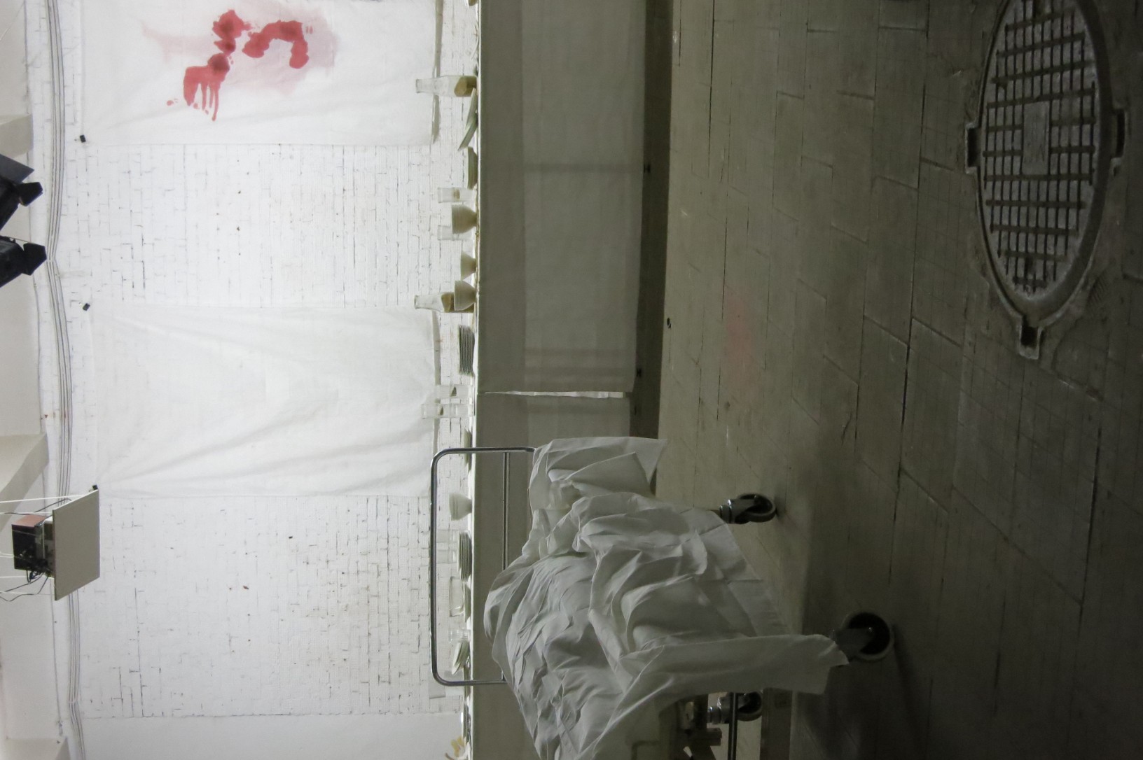 Multimedia installation consisting of 3 photos and film projections on 3 sheets (Birth, Love, X-ray), video-art (Movies) – 5.07 minutes; 5 objects (Virginity, Refugees, Death, Feast, War).