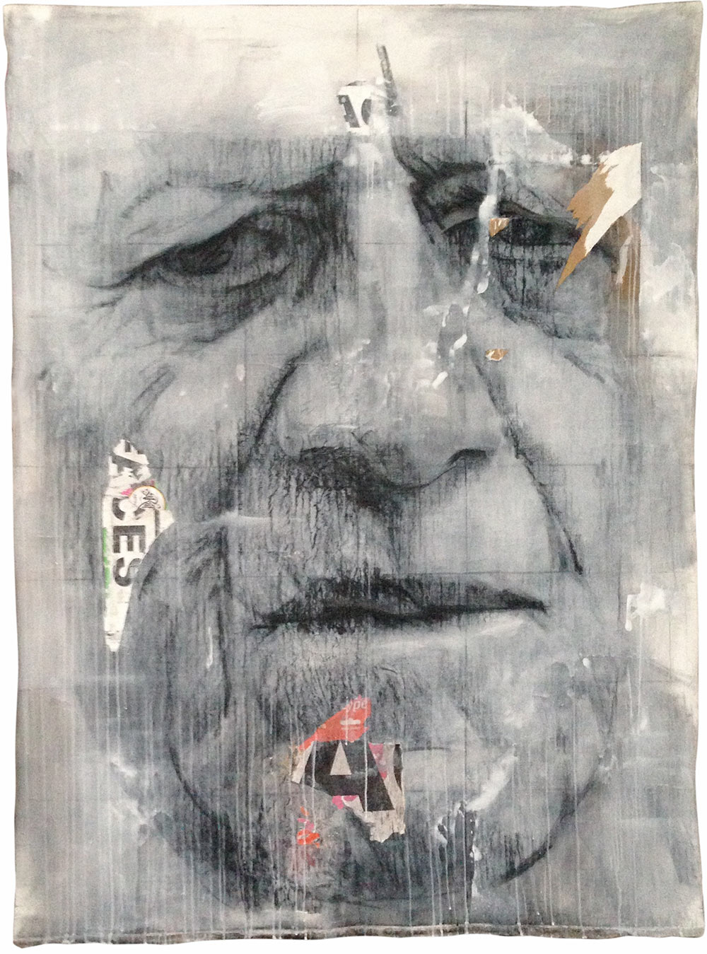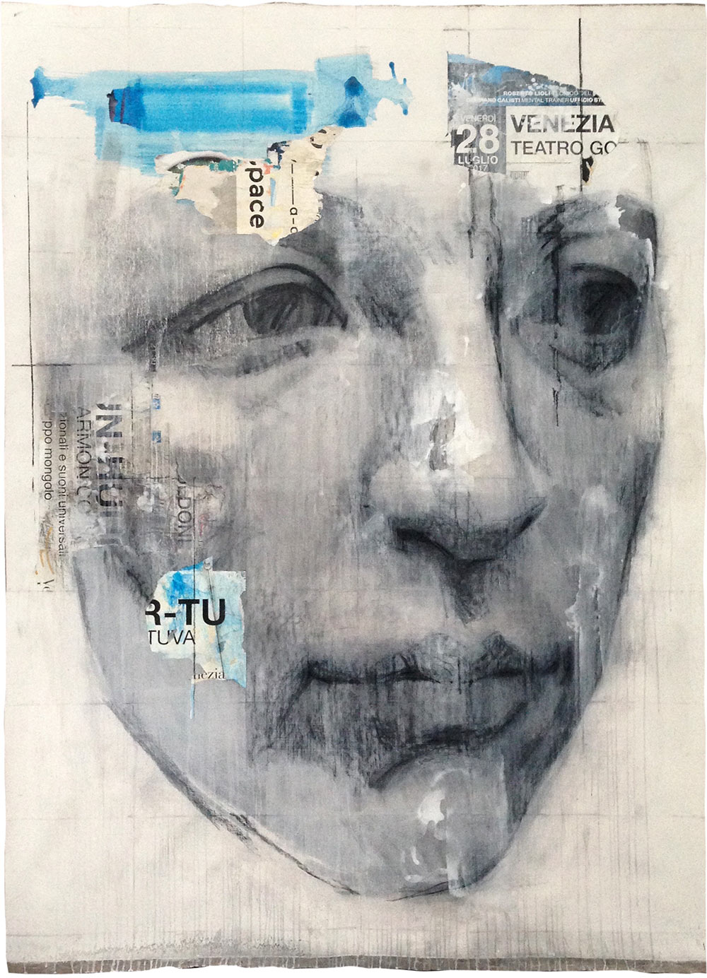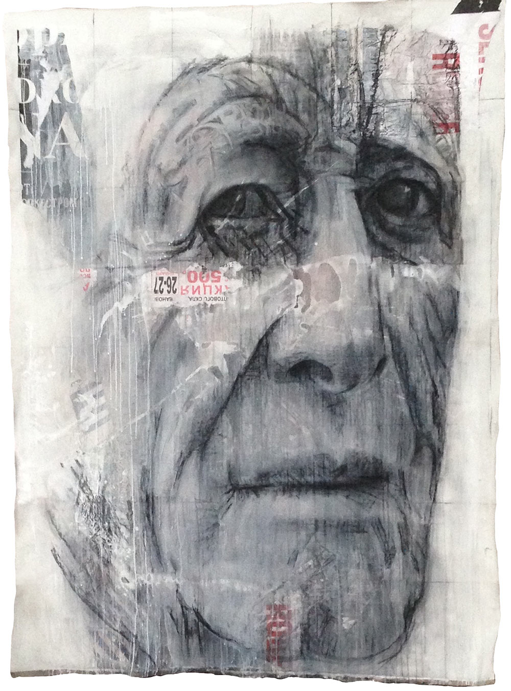 Портреты написаны на воображаемой стене с фрагментами афиш, фотографий, объявлений с малоразличимым текстом. Это приметы и следы мелькающего времени, на которых наш взгляд останавливается и тем самым фиксирует ускользающее мгновение.