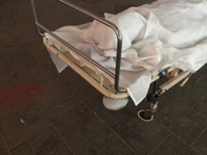 в простыню заворачивают и уносят тело.